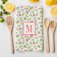 Serviette de cuisine blanche monogramme avec monogramme rose au centre sur un motif vert botanique de palmier tropical feuille et fleurs exotiques roses.
