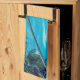 Une serviette de cuisine avec une photo à thème tropical avec des cocotiers s'étirant sur une plage de sable blanc isolée. Eaux turquoise et ciel bleu azur en arrière - plan.