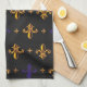 Serviette de cuisine de 16" x 24" à l'image de fleurs de lis violettes et d'or sur le noir. Voir serviettes assorties, serviettes en papier, set de table en tissu, set de table en papier et dessous de verre. Voir toute la collection de serviettes de cuisine Mardi Gras dans le FOOD/BEV| Section Linens.