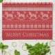 Cette serviette de cuisine saisonnière a un motif de couture en faux style nordique amusant en rouge et blanc. Les images du motif comprennent des flocons de neige et des chevaux rocking. Une bordure rouge correspondant à une extrémité contient votre texte personnalisé. Festive pour la saison des Fêtes, brillante, et une petite touche mignonne sur un motif classique. *Veuillez noter que le tricot est simulé dans le motif imprimé.