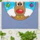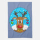 Joli renne marron avec un nez brillant. Il porte une cravate d'arc jaune autour du cou et a des billes accrochées à ses oreilles. Tangés dans ses bois bruns sont brillants lumières de Noël. Derrière lui, il y a une journée d'hivers où le flocon blanc tombe sur le sol enneigé.