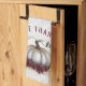Élégante serviette de cuisine sur le thème de l'automne illustrant un citrouille blanc avec parties scintillant en faux or et fleurs rouges bordeaux. Le arrière - plan est de la texture en bois blanc. Le texte en haut dit "Merci."