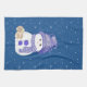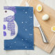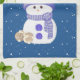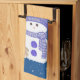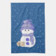 Deux petits lapins marron et blanc se balancent à un bonhomme de neige dans un casquette et une écharpe bleus, avec de gros boutons bleus, comme la neige tombe autour d'eux, et à travers l'arrière - plan. Serviette de cuisine entièrement mignonne pour Noël !