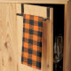 Serviette de cuisine avec motif écossais décoratif orange et noir. Idée de décoration pour la saison des Fêtes et des Automnes.