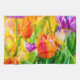 Tulipes colorées sur un lit à fleurs. Presque toutes les couleurs arc-en-ciel présentes. Scène florale lumineuse et positive. Photographie macro.