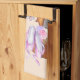 Une serviette de cuisine avec le dicton inspirant : Dansez avec les papillons. Un design féminin doux. Illustré d'une aquarelle représentant un violon en bois, des pantoufles de ballet rose se reposent contre elle et sont décorés de fleurs et de papillons. Placez-vous sur un arrière - plan rose pêche.