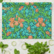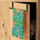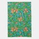 Serviette de cuisine dans un William Morris, Art Nouveau, imprimé textile d'iris et de feuilles, numériquement rehaussée et colorée, en orange, vert citron et douce aqua, sur un arrière - plan profond turquoise