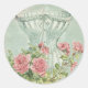 Vintage looking design for a lingerie party featuring a digital collage of elegant, feminine and antique corset adorned with beautiful vintage pink roses, on mint green background. For a shabby and aged look, light handwritten script details were added to this textured romantic design. Great as bridal shower seals or favour tags.