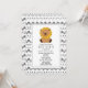 A baby shower invitation featuring an illustration of a baby lion over a black and white chevron and dot background. Personalize the black text.
