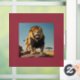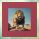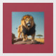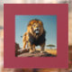 A powerful lion, mane flowing, roars triumphantly atop a sun-baked rock in the savanna. A bright blue sky with fluffy white clouds creates a clean, eye-catching backdrop .