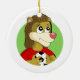 Ceramic Ornament with illustration of head of cute smiling lion dress in red sports dress holding a football ball, in green circle, illustrated by Radka Kavalcova