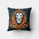 Stylized lion's head at the centre, adorned with a crown. The lion's mane is illustrated with vibrant orange and yellow colours, resembling flames.