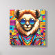 The image is a digital illustration of a lion dressed in a stylish manner, standing in the centre against a vibrant and colourful geometric background. The animal has round sunglasses with blue lenses and a jacket that boasts colourful geometric patterns. The animal's pose and accessories suggest a cool and confident demeanour. The backdrop is a kaleidoscope of colours, including yellow, red, blue, orange, brown, and green, composed of various irregular geometric shapes that contribute to creating a lively and dynamic atmosphere.