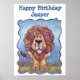 Animal Parade Cute Lion Happy Birthday Personalized Party Poster with our original art of a whimsical lion standing in the green grasses of the savanna with a textured blue sky and a playful wavy purple border painted by our talented children's artist, Traci Van Wagoner. Above our whimsical lion art are the customizable words, Happy Birthday (add your name, in a bold blue font. Join the Animal Parade and throw your kid an animal-filled bash with our fun heads and tails lion themed birthday party gear. To kickstart your party, send all your child’s friends an invitation they can’t refuse. Have a rip-roaring good time!