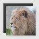 In the image, a male lion stands proudly against a light background. His majestic mane frames his noble face, exuding strength and authority. At his feet lies a vibrant green leaf, symbolizing the harmony between the king of beasts and the natural world
