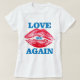 A bright graphic featuring a pair of bold, red lipstick-marked lips in the centre. Surrounding the lips are the words LOVE at the top and AGAIN at the bottom, both in large, vibrant blue letters. The word ME is placed in the middle of the lips in white, creating a striking contrast. The background is plain white, enhancing the overall visual impact.