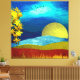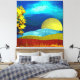 A beautiful abstract landscape design with a unique sky resembling ripples in liquid and a moon, mountains, and a golden tree.