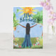 Joliment illustré Litha Summer Solstice design de collage comprenant un soleil rayonnant, des abeilles et leur ruche, des fleurs d'été, des verts, des champignons et une femme magnifique en robe bleue. Envoyez un sourire à vos Amours avec cette carte colorée et brillante.