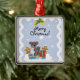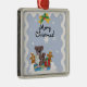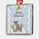 A precious Christmas ornament with a cute little brown bear in pyjamas sitting on a colourful quilt with presents. A little gingerbread boy and girl sit on his blanket as they all float on a cloud through the snowy sky. A little bow and a "Merry Christmas" make this an adorable ornament for everyone.