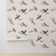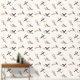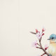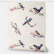 A wallpaper with a pattern of little birds on blossom tree branches. There are five different birds on an off white background