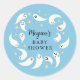 Cute little boo theme baby shower favour sticker featuring illustration of ghosts with stars. Background is blue.