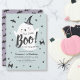This cute "little boo" halloween boy's 1st/first birthday invitation features a blue background with a cute ghost. The reverse side features bat patterns on a purple background. Personalize it for your needs. You can find matching products at my store.