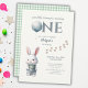 Hop into a stylish and timeless first birthday celebration with this adorable bunny invitation! Designed in a soft watercolor style, this charming invite features a cute bunny in blue trousers and a cozy scarf, surrounded by delicate rabbit paw prints for extra sweetness. The modern text "Our Little Bunny is Turning" pairs beautifully with "ONE," where the O is a whimsical blue watercolor balloon. The back completes the look with a classic green and white plaid pattern matching the bunny’s scarf. Easily customize all text to fit your party details!