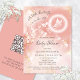 The top portion of this artistic girl baby shower invitation features a white butterfly in a halo and white flowers on an apricot blush pink watercolor background. The ink watercolor background has golden spots mixed with white transparent flowers. With a headline in an elegant calligraphic script that say: "A little butterfly is on her way", the thank you headline in the same script, a custom text an custom names.