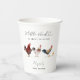 Rustic and boho farm theme baby shower paper cup featuring illustration of chickens and a chick. The text says "a little chick is on the way."