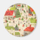 Retro design with red and lime green. Christmas village with decorated Christmas trees, decorated houses, people walking about and cars in driveways. Cute
