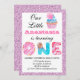 Girly and sweet Little Cupcake purple lilac glitter first birthday invitation with doughnut and candy letters. Easily add your full name, and the date, time and address of the birthday party. Perfect for a sweet little princess turning one!