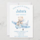 Elegant invitation for your little one's first birthday in shades of blue. The adorable bear flying an airplane placed in the centre of the invitation will set a joyful mood for the invited guests. The illustration is watercolor-painted.