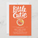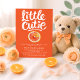 Little Cutie White Text Orange Baby Shower. Available digitally and printed. Little Cutie is in a set modern script. Easily personalise the rest of the words as required.