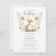 A sweet little illustrated plush toy duckling watercolor soft pastel baby shower with earthy rustic cream and brown hues, with florals. Gender neutral for boy or girl. A pretty earthy style with a lovely rhythmic flow of type and image. Solid brown on the back of the invite.