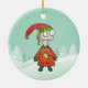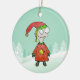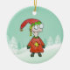 Goofy little cartoon elf girl with googly eyes, two teeth, blonde hair and a braid, wearing a red dress with green trim and yellow star on the front. Her matching hat is set off with a gold a jingle bell. Original cartoon art by Taylor Addams. Cartoonist. Mensch.