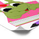 Cute little green frog laying on her stomach over a school book. She;s wearing pink and a purple pencil is in front of her