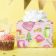 This camping themed wrapping paper is perfect for little girls. Watercolor illustrations of tents, camp chairs, lanterns, toasting marshmallows and more gear for the happy camper are set against a soft pink background.