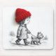 A little girl in a bright red knitted hat walks her dog, beautifully captured in a watercolor and three-dimensional sketch, showcasing the joy of childhood