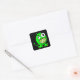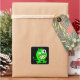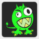Funny looking little devil cartoon in neon green. This little guy has a big round face. One eye is bigger than the other making him look googly-eyed. He has some sharp fangs and a cute little devils tail.