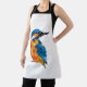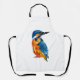 traditional watercolor artwork of a little kingfisher bird in blue and orange watercolors on an apron.
