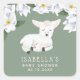 Cute little lamb theme baby shower favour sticker featuring an illustration of a baby sheep laying down with a sweet smile on her/his face. There are white magnolia flowers at the top. This gender neutral design is great for both baby girls and boys.