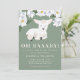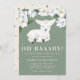 Cute gender neutral little lamb theme baby shower invitation template card featuring an illustration of a baby sheep laying down with a sweet smile on her/his face. There are white magnolia flowers at the top. This green colour invite is great for both baby girls and boys. The text says "OH BAAABY! A little lamb is on the way."