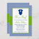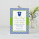 A modern navy blue chevron pattern with accents of green. Featuring a cute romper with tie illustration. Perfect for a little man themed baby shower. Preppy and cute! Easily personalize for your baby shower.