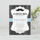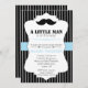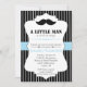 This precious baby shower invitation is a wonderful way to invite your guests to join you in celebrating your new arrival. This design has a black and white pinstripe background with an inset of white and a blue band in the centre. At the top there is a black graphic of a moustache. Your party details go below centred and are completely customizeable. Just add your Shower details and you are ready to go!