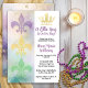 Celebrate the upcoming arrival of your little royal with this Little Mardi Gras King Baby Shower Invitation, inspired by the festive elegance of Mardi Gras traditions. Featuring a charming gold crown paired with soft watercolor fleur-de-lis accents in purple, green, and gold, this design blends Southern charm with baby-sweet sophistication.