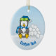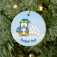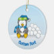 A little penguin cartoon sitting and holding a snowball. Custom text on both sides.