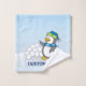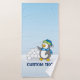 A little penguin cartoon waving in front of a snowball stack. Custom text.