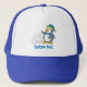 Little penguin with snow balls waving trucker hat