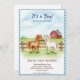 • An adorable watercolor design featuring two sweet little ponies standing in a grassy field in front of a rustic wooden fence and classic red barn. This delightful set is framed by a blue gingham border, perfect for a country farm-themed baby shower.
