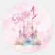 LIttle Princess Magical Castle Classic Round Sticker. A magical milestone sticker for your little princess. This adorable sticker features a dreamy clouded pink background with a charming castle in virbrant shades of pink, blue, yellow, and purple with butterflies. The script princess calligraphy font in bright pink adds a playful touch, making this the perfect invitation to announce your little one's magical day. Get ready for a royal celebration filled with fun, laughter, and joy